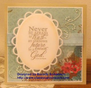 The card base is our new Pearlized Cocoa. It has a subtle sheen to it and is really pretty! The May Arts ribbon has just been added to the Classy Cards 'n Such online shop and is already a ribbon I love to use! All of the colors are in stock and just waiting to adorn your creations. The Lacey Ovals are among Spellbinders newest releases and just add elegance! The Smokey Brown Rhinestones are a little hard to see in the photograph but are the flower centers in the lower right corner. The Finesse Swirls are just icing on the cake! Links to all of our products are in the supply list below.